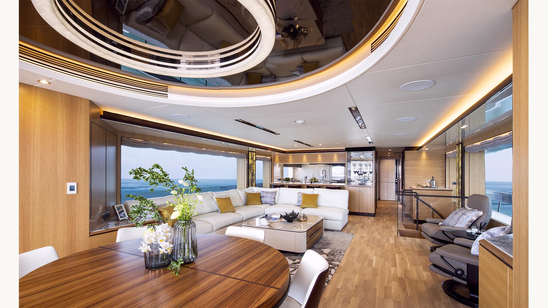 Welcomed by a spacious aft deck featuring a pleasant seating area with a bar, storage and television to starboard, guests enter the main deck through curved opening glass doors and are greeted by a delightful semi-al fresco dining area hosting an extendable round table set beneath a custom circular light fixture.